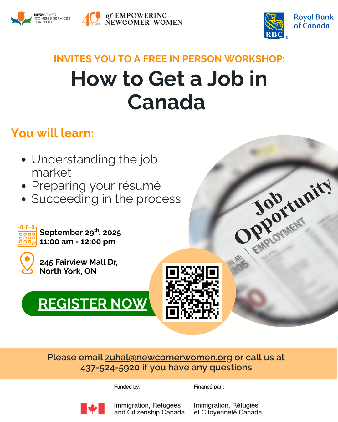 How to Get a Job in Canada Monday, September 29, 2025 11:00 AM 12:00 PM 11:00 12:00 Newcomer Women's Services Toronto 245 Fairview Mall Drive North York, ON, M2J 4T1 Canada (map) Google Calendar ICS You will learn: Understanding the job marketPreparing your résuméSucceeding in the process Register Now
